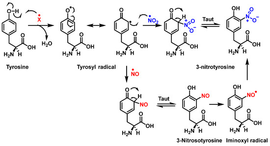 Figure 6 shows the mechanism of tyrosine nitration described in the literature. Because of its short half-life of 10−2 s, peroxynitrite cannot react directly with tyrosine residues. Instead, it decomposes into oxidizing and nitrating species, including the radicals—•OH and•NO2. The radical •OH removes hydrogen from the phenol group of tyrosine. This produces the tyrosyl radical, which reacts with the •NO2 to form 3-nitrotyrosine 3- NTyr [12].