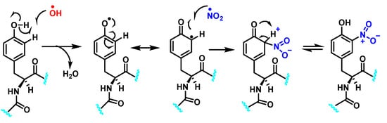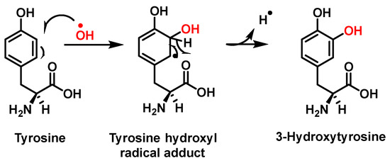Hydroxylation of tyrosine follows a similar mechanism, in which •NO2 is replaced by •OH, Figure 7. In the mechanism, the •OH can be added to the tyrosine phenyl ring, producing a hydroxytyrosyl radical, stable by odd-electron delocalization, to generate 3-hydroxytyrosine.