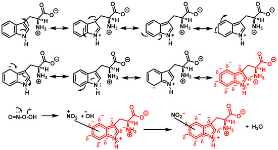 Alternatively, nitration can be accomplished by removing the hydrogen atom from the nitrogen to produce a stabilized tryptophanyl radical capable of delocalizing the odd electron throughout the six-membered ring, followed by the addition of the nitrogen dioxide radical, either in steps or simultaneously, as shown in Figure 10. In this way, the one-electron oxidation of tryptophan is thermodynamically possible because the reduction potential E°′ (ONOO−,2H+/•NO2, H2O), +1.4 V [33], is higher than E°′ (tryptophanyl radical, H+/tryptophan), +1.0 V [34].