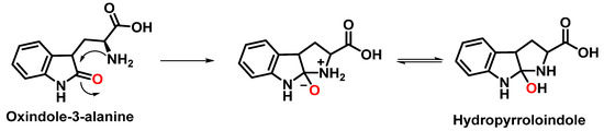 For the formation of oxindole-3-alanine, there is the addition of the •OH to C-2 and formation of the radical at C-3, stabilized by being delocalized with the double bonds of the benzene ring. The last step is the formation of the enol in tautomeric equilibrium with the ketone form [36], Figure 14.