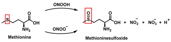 Peroxynitrous acid and peroxynitrite both react with methionine. The corresponding kinetic constants being Kacid = (1.7 ± 0.1) × 103 M−1 s−1 and Kanion = 8.6 ± 0.2 M−1 s−1. Nitrites, nitrates, and methionine sulfoxide were the only byproducts identified, Figure 17.
