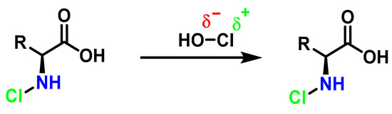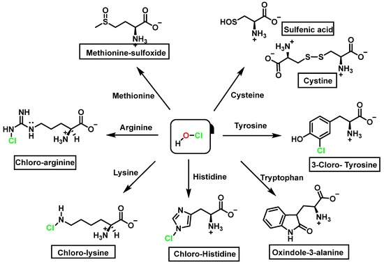 HOCl interacts rapidly with amines and, to a lesser extent, with amides, producing chlorinated derivatives such as chloramines (R-N(R’)-Cl) and chloramides (R-C(O)-N(R’)-Cl). These compounds can be further oxidized to produce dichlorinated species (R-N-Cl2). The α-amino group of amino acids, the N-terminus of peptides and proteins as well as nucleophilic sites on the side of protein chains can be chlorinated (e.g., lysine, arginine). Depending on the ratio of chlorine to amino acid, chlorination of amino acids leads to the formation of organic mono- or di-chloramines. Aldehydes, nitriles, and N-chlorodimines are all likely by-products of the degradation of organic chloramines, and all three pose a risk to human health. Chloramine production interferes with protein folding and causes protein aggregation [27].