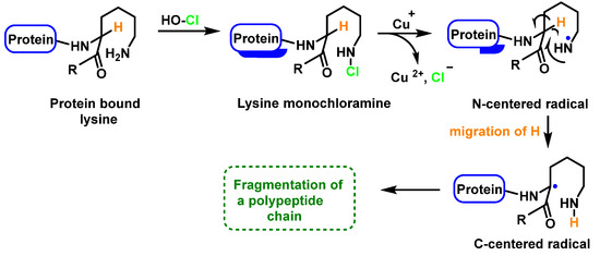 - Hawkins, C.L.; Davies, M.J. Hypochlorite-induced damage to proteins: Formation of nitrogen-centred radicals from lysine residues and their role in protein fragmentation. Biochem. J. 1998, 332, 617–625. [Google Scholar] [CrossRef]