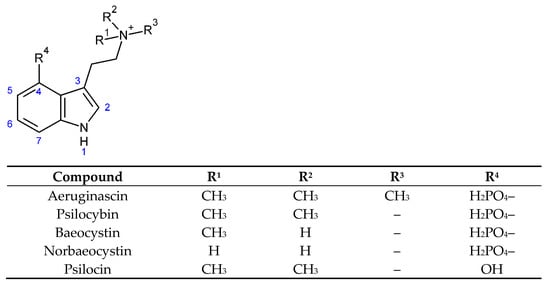 - Jensen, N.; Gartz, J.; Laatsch, H. Aeruginascin, a trimethylammonium analogue of psilocybin from the hallucinogenic mushroom Inocybe aeruginascens. Planta Med. 2006, 72, 665–666. [Google Scholar] [CrossRef] [PubMed]