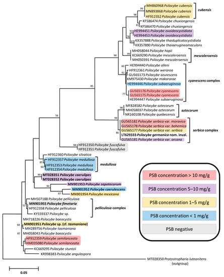 - Ramírez-Cruz, V.; Guzmán, G.; Villalobos-Arámbula, A.R.; Rodríguez, A.; Matheny, P.B.; Sánchez-García, M.; Guzmán-Dávalos, L. Phylogenetic inference and trait evolution of the psychedelic mushroom genus Psilocybe sensu lato (Agaricales). Botany 2013, 91, 573–591. [Google Scholar] [CrossRef]