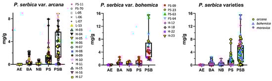 | Psilocybe serbica var. bohemica | 20 | 8 | 0.008–0.093 | 0.234–2.473 | 0.173–1.282 | 0.027–2.485 | 1.553–15.543 |