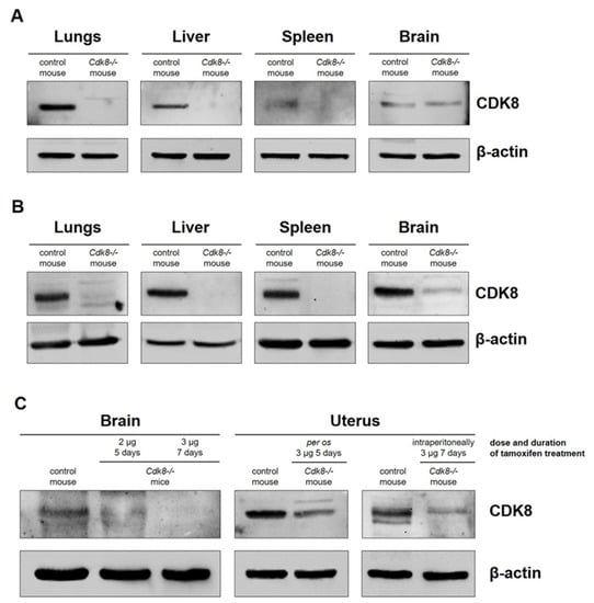 We demonstrated that the tamoxifen feeding method is appropriate for knockout of the target gene in mice organs such as lungs, liver, and spleen (Figure 1A). However, we observed only moderate CDK8 decrease in the uterus and did not observe the CDK8 decrease in the brain of the knockout mice. No CDK8 protein was detected in kidneys even of the wild type animals.