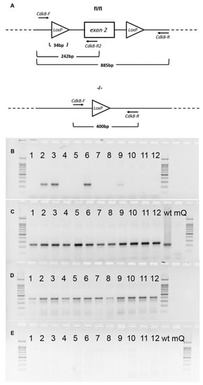 (A)—Schemes of loxP-sites localization in Cdk8 gene of Cdk8fl/fl mice (upper scheme) and Cdk8−/− mice (lower scheme) and annealing positions of PCR primers used for genotyping of animals. (D,E)—PCR detection of 2nd Cdk8 exon excision. Panels (B,C) represent CDK8-F + R2 PCR product, which is 242 bp (A) in case of floxed exon 2 presence and is absent when the exon is completely excised. (D,E)—from PCR with F + R primer pair that flanks the whole floxed exon (~890 bp). Panels (B,D) correspond to a set of genomic PCRs of organs from tamoxifen-treated Cdk8fl/fl female mice. (C,E)—those of Cdk8fl/fl control mouse. Organs are shown in the following order: 1—heart, 2—ovary, 3—uterus, 4—liver, 5—lung, 6—brain, 7—muscle (quadriceps), 8—kidney, 9—small intestine, 10—thymus, 11—spleen, 12—bone marrow. “wt”—wildtype mouse tail sample; “mQ”—no template control.