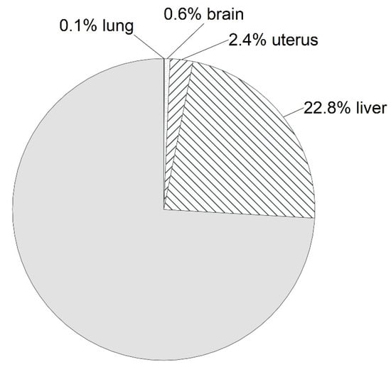 Notably, average liver tamoxifen concentration constituted 4.1 × 105 ng/g at 4 h when injected (ranging (1.86–7.00) × 105 ng/g), which, taking liver mass (m = 1.67 g []) into account, makes up 0.684 mg (22.8%) of total 3 mg applied (Figure 3).