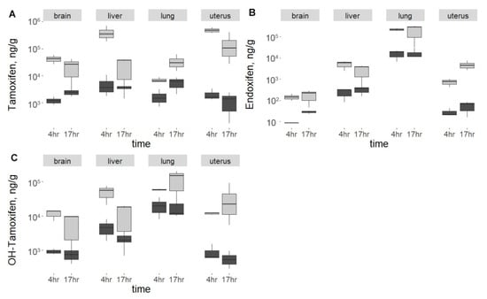 Tamoxifen (A) and its metabolites (B,C) concentrations in organs in exponential scale. Pale (□) boxes represent injection method, while feeding method samples are shown dark (■).