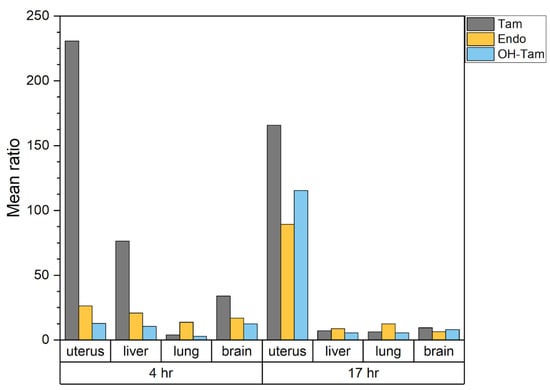 To determine the distribution of tamoxifen and its metabolites within a mouse body, we measured absolute concentrations of substances in several organs: brain, uterus, liver and lungs using liquid chromatography with tandem mass spectrometry (LC-MS/MS).