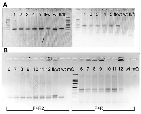 Analysis of exon 2 excision in embryos by DNA electrophoresis. Single 208 bp band without 242 bp band (left sides, “F + R2”) confirmed the presence of wild type allele and complete excision of floxed sequence, while presence of both bands indicates incomplete excision. 414 bp (right sides, “F + R”) confirms presence of edited allele. (A) Complete excision of exon 2 after tamoxifen administration starting at 10.5 dpc (lanes 1–5). (B) Incomplete excision (lanes 10–12) of exon 2 after tamoxifen administration starting at 17.5 dpc. “fl/wt”—treated heterozygous for a floxed exon mouse sample, “wt”—wildtype mouse, “fl/fl”—untreated homozygous for floxed exon mouse sample, mQ—no template control (milliQ water).