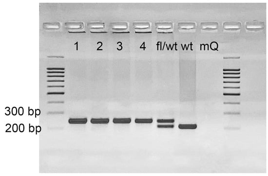 Genotyping of Cdk8fl/fl mice. 208 bp band corresponds to the wild type allele and 242 band to the floxed allele. “fl/wt”—untreated heterozygous for a floxed exon mouse sample. “wt”—wildtype mouse. mQ—no template control (milliQ water). Lanes 1–4 with 242 bp bands give an example of homozygous for floxed exon samples.