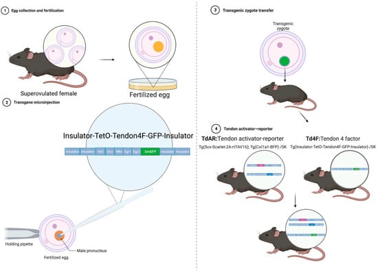 Scheme of TdAR-Td4F transgenic mouse generation. The constructed recombinant plasmids containing Insulator-TetO-Tendon4F-GFP-Insulator were linearised and purified. Then, Tg(Insulator-TetO-Tendon4F-GFP-Insulator)/SK for the tendon 4-factor transgenic mouse (Td4F) mouse line was obtained with a pronuclear microinjection []. Tg(Scx-Scarlet-2A-rtTAV16) Tg(Col1a1-BFP)/SK for the tendon activator–reporter (TdAR) transgenic mouse [] was crossed with the Td4F mouse line. The above strategy obtained a novel inducible tendon-specific gene expression transgenic mouse strain: TdAR-Td4F mouse. (This figure was created using BioRender.com. The grey blocks represent genes, the green blocks represent green fluorescent protein reporter genes, the purple blocks represent mScarlet fluorescent protein reporter genes and the blue blocks represent blue fluorescent protein reporter genes.)