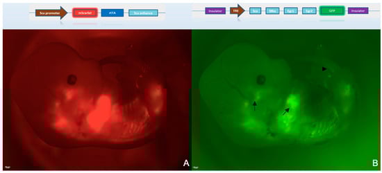 At E12.5, the Scx+ tendon progenitor cells were concentrated at the tendon progenitor base in the limbs, ribs and head []. Through the use of binocular microscopy, it was observed that the mScarlet fluorescent protein was stably expressed in transgenic mouse embryos and entirely consistent with the region’s tendon-specific expression (Figure 2A). This implied that the reverse tetracycline-controlled transactivator-rtTA protein was located in these Scx+ tendon progenitors []. emGFP in the E12.5 transgenic mouse embryos faithfully recapitulated the tendon-specific nature of the induction system (Figure 2B). In TdAR-Td4F embryos of E12.5, the ligaments of the developing intracranial region outlined the ipsilateral masticatory and temporalis muscles []. EmGFP fluorescence in the limbs was brighter than in the connective tissue connecting the ribs and spinal regions, indicating the presence of a high enrichment in tendon progenitor cells, consistent with the higher Scx expression in the limb tendons than in the axial tendons [].
