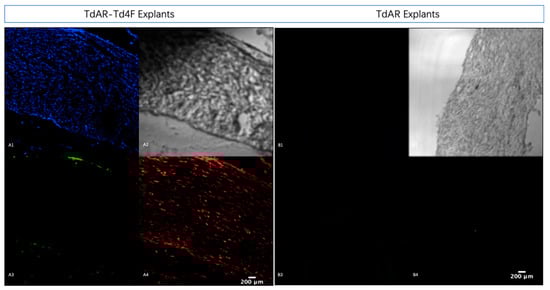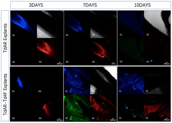 The outer sheath of the Achilles tendon essentially impairs the observation of fluorescent proteins using confocal microscopy. Therefore, the sheaths of the Achilles tendons were partially removed using a scalpel []. Then, the explants from TdAR and TdAR-Td4F mice were exposed to a culture medium containing doxycycline for 24 h to achieve transient Td4F-induced overexpression. Explants from TdAR-Td4F mice were observed to express Td4F-EmGFP the day after the induction, whereas no green fluorescent signal was detected in explants from TdAR mice (Figure 3B,E). This implied that the Td4F expression was induced and regulated by rtTA in the Scx-rtTA-mScarlet transgene.