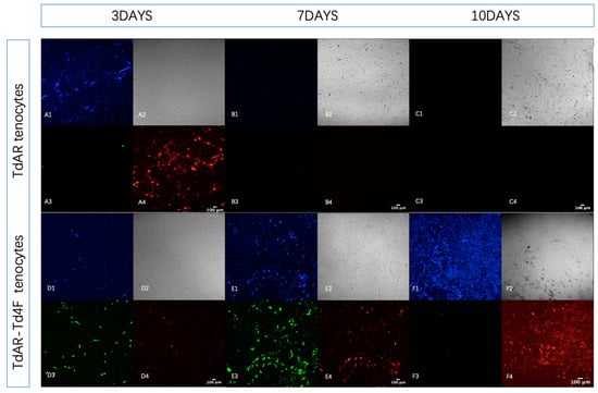 Td4F increased Scx-mScarlet and Col1a1-BFP expression in Scx+ primary Achilles tendon cells in vitro. To confirm, at the cellular level, the increased expression of Scx-mScarlet and Col1a1-BFP in Scx+ primary Achilles tendon cells after induction of Td4F-EmGFP overexpression, tendon cells were extracted from the Achilles tendons of TdAR mice and TdAR-Td4F mice, respectively, for 24 h of induction. The experiment was repeated three times independently, using cells from different donors. (A–C) show primary Achilles tenocytes from TdAR mice cultured under confocal microscopy for three, seven and ten days (×10 magnification); 1–4 show Col1a1-BFP (A1–F1), brightfield (A2–F2), Td4F-EmGFP (A3–F3) and Scx-mScarlet (A4–F4) (×10 magnification) in confocal microscope view. It can be seen that in the absence of overexpression of Td4F, Scx-mScarlet and Col1a1-BFP gradually decreased. At ten days, the signal was almost completely unobservable, implying that these genes lost expression. (D–F) show views of tendon cells from TdAR-Td4F mice cultured for three, seven and ten days, respectively, under confocal microscopy (×10 magnification). (D) One day after exposure to doxycycline culture, EmGFP expression began in tendon cells from TdAR-Td4F mice, indicating that Td4F was significantly overexpressed in Scx+ cells from TdAR-Td4F mice. (E) Td4F overexpression resulted in enhanced expression of Scx-mScarlet and Col1a1-BFP compared to three days. (F) Expression of Col1a1-BFP and Scx-mScarlet remained at high levels after Td4F-EmGFP expression was stopped.