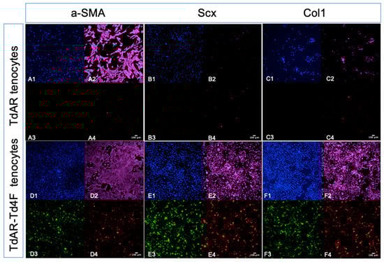 Overexpression of Td4F in tenocytes upregulated Scx and Col1a1 while reducing a-SMA expression. To further confirm the expression of Scx and Col1a1 and the fibrosis marker a-SMA in Scx+ primary Achilles tenocytes after induction of Td4F-EmGFP overexpression, we applied immunohistochemical staining (IHC) to tenocytes cultured for seven days using antibodies against Scx, Col1a1 and a-SMA. (A–C) show the results of staining for a-SMA, Scx and Col1a1 in primary Achilles tenocytes from TdAR mice under confocal microscopy (×10 magnification); 1–4 show the confocal DAPI staining (A1–F1), immunofluorescence staining (A2–F2), Td4F-EmGFP (A3–F3) and Scx-mScarlet (A4–F4) (×10 magnification). Focused microscope views. (D–F) show the results of staining for a-SMA, Scx and Col1a1 in primary Achilles tenocytes from TdAR-Td4F mice under confocal microscopy (×10 magnification). It can be seen that the expression of Scx-mScarlet was significantly higher in the case of the overexpression of Td4F. (A2,D2) Td4F overexpression reduced a-SMA expression in tenocytes, implying that Td4F has an antifibrotic potential. (B2,E2) Td4F overexpression increased Scx expression in tenocytes, implying that Td4F expression maintained tenocyte identity. (C2,F2) Td4F overexpression increased Col1a1 expression in tendon cells, suggesting that Td4F expression could promote tendon recovery after injury.