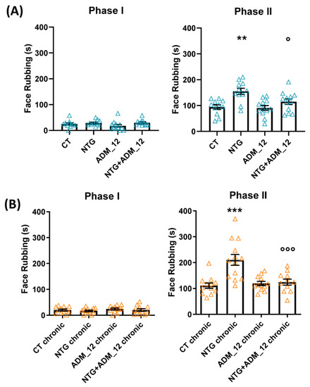 Effects of ADM_12 (30 mg/kg) in the orofacial formalin test. Face rubbing time (seconds) during Phase I and II of the orofacial formalin test in the acute migraine model (A) and in the chronic migraine model (B). CT: Control. Data are expressed as the mean ± SEM. One-way ANOVA followed by Tukey’s multiple comparisons test (n = 11–13 per group). ** p < 0.01 vs. CT and ADM_12; ° p < 0.05 vs. NTG; *** p < 0.001 vs. CT chronic and ADM_12 chronic; °°° p < 0.001 vs. NTG chronic.