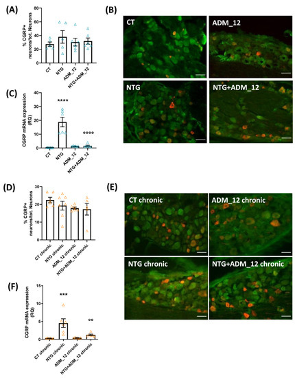 Effects of ADM_12 (30 mg/kg) on CGRP expression in the TG ipsilateral to formalin injection. Acute migraine model: (A) immunofluorescence analysis of the percentage of CGRP-positive neurons/tot. neurons (n = 5–6 per group) and representative photomicrographs (B). Red: CGRP; Green: NeuN; Yellow: merged. Scale bars: 50 µm. (C) CGRP mRNA levels, expressed as relative quantification (RQ; see Methods for details) (n = 6 per group). CT: Control. **** p < 0.0001 vs. CT and ADM_12; °°°° p < 0.0001 vs. NTG. Chronic migraine model: (D) immunofluorescence analysis of the percentage of CGRP-positive neurons/tot. neurons (n = 5–7 per group), and representative photomicrographs (E) Red: CGRP; Green: NeuN; Yellow: merged. Scale bars: 50 µm. (F) CGRP mRNA levels, expressed as relative quantification (RQ; see Section 4 for details) (n = 6 per group). *** p < 0.001 vs. CT chronic and ADM_12 chronic; °° p < 0.01 vs. NTG chronic. Data are expressed as the mean ± SEM. One-way ANOVA followed by Tukey’s multiple comparisons test.