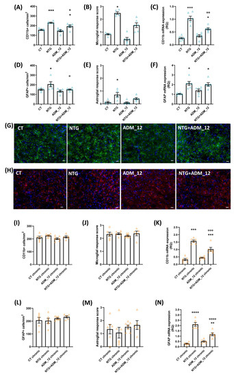 2.3. ADM_12 Reduced NTG-Induced Neuroinflammation at Central and Peripheral Levels
