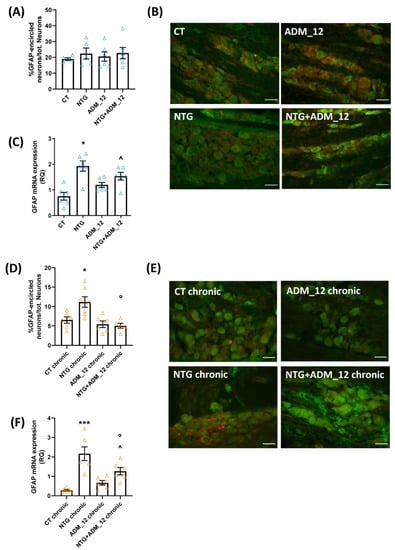 Following the TG ipsilateral to formalin injection, we did not observe changes in the activation of satellite glial cells (evaluated as the percentage of neurons surrounded by GFAP-positive cells [30]) after acute NTG treatment alone or in combination with ADM_12 (Figure 4A,B) compared with the CT group. In contrast, we found a significant increase in GFAP gene expression that was not counteracted by ADM_12 treatment (Figure 4C). In contrast, chronic NTG treatment increased satellite glial cell activation as well as GFAP gene expression levels. The NTG-induced effects were counteracted by ADM_12 administration (Figure 4D–F).