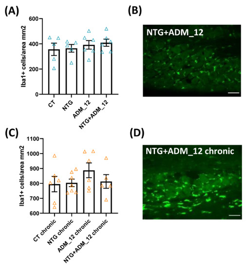 Effects of ADM_12 (30 mg/kg) on macrophage cell infiltration in the TG ipsilateral to formalin injection. Acute migraine model: (A) number of infiltrating macrophages (expressed as ionized calcium binding adaptor molecule 1 (Iba1)-positive cells per area in mm2) (n = 5–6 per group) and representative photomicrographs of the NTG + ADM_12 group (B); Green: Iba1. Scale bars: 50 µm. Chronic migraine model: (C) Number of infiltrating macrophages (expressed as Iba1-positive cells per area in mm2) (n = 5–7 per group) and representative photomicrograph of the NTG + ADM_12 group (D); Green: Iba1. Scale bars: 50 µm. CT: Control. Data are expressed as mean ± SEM. One way ANOVA followed by Tukey’s multiple comparisons test.