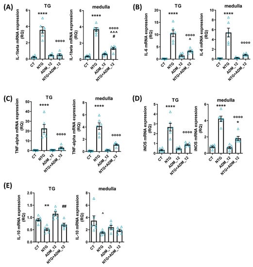 Effects of ADM_12 (30 mg/kg) on the gene expression of pro- and anti-inflammatory cytokine mediator gene expression in the Medulla oblongata and following the TG ipsilateral to formalin injection. (A) IL-1beta, (B) IL-6, (C) TNF-alpha, (D) iNOS, (E) IL-10 mRNA levels (expressed as relative quantification, RQ; see Section 4 for details) in the acute migraine model (n = 6 per group). CT: Control. * p < 0.05, ** p < 0.01 and **** p < 0.0001 vs. CT and ADM_12; °°°° p < 0.0001 vs. NTG; ^ p < 0.05 and ^^^ p < 0.01 vs. CT; # p < 0.05 and ## p < 0.01 vs. ADM_12. Data are expressed as the mean ± SEM; one way ANOVA followed by Tukey’s multiple comparisons test.