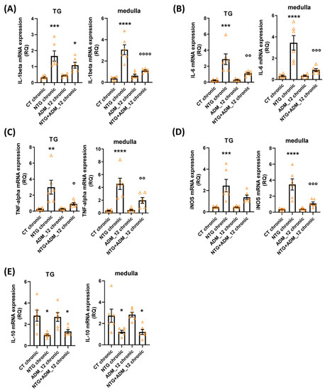 Effects of ADM_12 (30 mg/kg) on the gene expression of pro- and anti-inflammatory mediators in the Medulla oblongata and following the TG ipsilateral to formalin injection. (A) IL-1beta, (B) IL-6, (C) TNF-alpha, (D) iNOS, (E) IL-10 mRNA levels (expressed as relative quantification, RQ; see Section 4 for details) in the chronic migraine model (n = 6 per group). CT: Control. * p < 0.05, ** p < 0.01, *** p < 0.001 and **** p < 0.0001 vs. CT chronic and ADM_12 chronic; ° p < 0.05, °° p < 0.01, °°° p < 0.001 and °°°° p < 0.0001 vs. NTG chronic. Data are expressed as the mean ± SEM; one way ANOVA followed by Tukey’s multiple comparisons test.