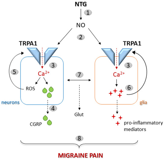 Schematic representation of the putative TRPA1-mediated mechanisms involved in migraine pain. The administration of NTG promotes the formation of nitric oxide (NO) (1) which directly activates TRPA1 channels (2). Once activated, these channels allow the intracellular concentration of calcium to increase (3). At the neuronal level, TRPA1 activation promotes the release of CGRP (4) and the generation of reactive oxygen species (ROS), which can sensitize the TRPA1 channels (5). In glial cells, following TRPA1 activation and calcium entrance (3), the expression of glial markers and pro-inflammatory molecules (sensitizing TRPA1 channels) increases (6) and neuron–glia coupling promotes glutamatergic signaling (Glut) (7). All of these processes contribute to the generation and maintenance of migraine pain (8).