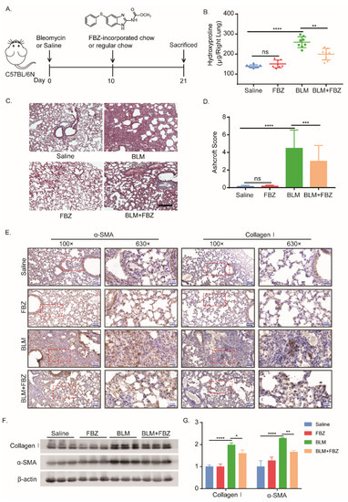 FBZ attenuated bleomycin-induced lung fibrosis. C57BL/6 mice received intratracheal instillation of bleomycin (1.5 U/kg) or equal volume 0.9% saline. Mice were fed with the regular feed (control group) or FBZ-impregnated feed (150 ppm FBZ) from day 10 post bleomycin challenge for additional 10 days. (A) Schematic diagram illustrating the time course of treatment with FBZ after bleomycin-induced lung injury. The effect of FBZ on pulmonary fibrosis was assessed by (B) quantitative hydroxyproline assay of the right lung (mean ± SD, n = 8 mice per group) and confirmed by (C) representative images of Masson’s trichrome staining of the lung section (bar = 300 μM) and (D) Ashcroft score (mean + SD). (E) Representative immunohistochemical stain images of collagen I and α-SMA. (F) Immunoblot assay of collagen I and α-SMA in the lung homogenate; β-actin used as the loading control. (G) Corresponding optical densitometry analysis of (F) (mean + SD). * p < 0.05, ** p < 0.01, *** p < 0.001, and **** p < 0.0001.