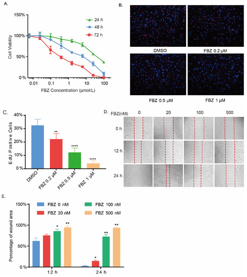 Lung fibroblasts are the main effector cells of pulmonary fibrosis. Reducing the activation and proliferation of fibroblasts was shown to effectively prevent the development of pulmonary fibrosis [4]. To further explore the anti-fibrosis effect of FBZ, in vitro experiments were assessed on human embryonic lung fibroblast IMR-90 cells. The potential effect of FBZ on the viability and proliferation of fibroblasts was assessed by CCK-8 assay and EdU incorporation assay. FBZ showed a concentration- and time-dependent inhibitory effect on the vitality of fibroblasts (Figure 2A). Consistently, a notable reduction in EdU-positive cells in response to FBZ treatment in a concentration-dependent manner was observed (Figure 2B,C). In addition, FBZ significantly suppressed IMR-90 cell migration evaluated by wound healing assay (Figure 2D,E). Taken together, these results showed that FBZ exhibited potent concentration-dependent inhibitory effects on the proliferation and migration of lung fibroblasts.