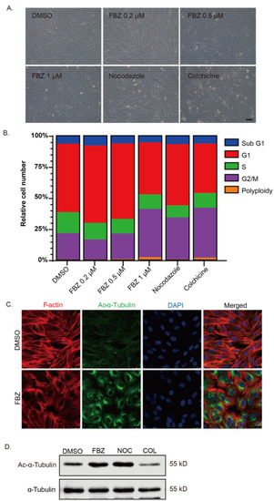 Previous studies have indicated that FBZ acts as a moderate microtubule-destabilizing agent. We aimed to test if the anti-proliferation effect of FBZ could be attributed to the disruption of the microtubule cytoskeleton. Fibroblasts treated with a high concentration of FBZ (≥0.5 μM) were subject to drastic contractile morphological changes, suggesting disruption of the cytoskeleton (Figure 3A). Consistent with the morphological alteration, a high concentration of FBZ (≥0.5 μM) caused cell cycle arrest in the mitotic phase while it only exhibited a marginal effect at a lower concentration (≤0.2 μM). In comparison, the microtubule inhibitors nocodazole and colchicine caused cell cycle arrest at much lower concentrations (Figure 3B). Immunofluorescent staining showed that the cell morphology changes in the FBZ-treated fibroblasts was associated with reduced stress fiber assembly. However, interestingly, FBZ or nocodazole treatment led to a notable accumulation of acetylated α-tubulin (Figure 3C,D). In comparison, the level of acetylated α-tubulin was significantly reduced in colchicine-treated fibroblasts (Figure 3D). These results indicated that the inhibitory effects on the migration and proliferation of lung fibroblasts could partially be attributed to the disruption of the microtubule cytoskeleton.