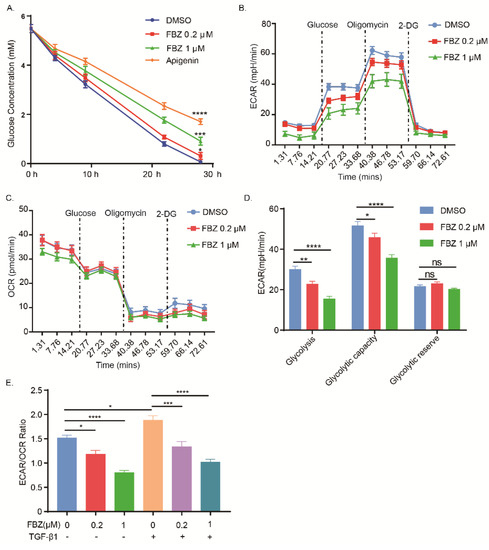 Extracellular acidification rate (ECAR) as a parameter of glycolytic flux was measured on a Seahorse XF96 bioanalyzer (Agilent technologies, Santa Clara, CA, USA) using a XF Glycolysis Stress Test kit (103020-100, Agilent technologies, Santa Clara, CA, USA) according to the manufacturer’s instructions. Briefly, IMR-90 cells were seeded on a 96-well assay plate overnight, then starved in a serum-free medium for 24 h. The medium was changed to complete medium, then treated with or without active TGF-β1 (5 ng/mL) for 24 h. For FBZ treatment, FBZ at the indicated concentrations was added 4 h before tests and was maintained in the assay medium.