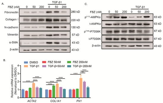 Next, we sought to explore the effect of FBZ on TGF-β1-induced fibroblast activation. FBZ inhibited TGF-β1-induced fibroblast-to-myofibroblast transition, as evidenced by reduced a-SMA and collagen I, as well as fibronectin, N-cadherin, and vimentin, in TGF-β1-stimulated fibroblasts (Figure 5A). This observation was further confirmed by RT-qPCR analysis of ACTA2, COL1A1, and FN1 (Figure 5B). To be noted, 200 nM FBZ alone significantly induced expression of COL1A1 and elevated collagen I but not the other mesenchymal cell markers. Furthermore, FBZ induced AMPK activation by phosphorylation at threonine 172 in fibroblasts regardless of TGF-β1 stimulation (Figure 5C). In addition, TGF-β1-induced mTOR activation was inhibited as phosphorylation of its downstream substrate P70S6K at threonine 389 was down-regulated in response to FBZ treatment (Figure 5C).