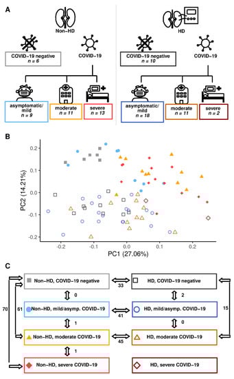 SARS-CoV-2 positive and negative individuals aged 18 years or older were recruited at the Medical University of Graz and the Hospital Favoriten, Vienna, Austria, as published previously []. Briefly, SARS-CoV-2 infection was tested by RT-PCR following a nasopharyngeal swab, and positively tested non-HD individuals and patients on HD were grouped according to disease severity: Asymptomatic and mild cases did not need any medical intervention and could be managed as outpatients. Moderate phenotypes had to be hospitalized. Patients with severe course were in need of intensive care. Furthermore, non-HD negative and HD negative controls without SARS-CoV-2 infection were included. In the non-HD cohort, advanced CKD stages (G3b and G4) were rare with a frequency of 0%, 11.1%, 9.1%, and 30.8% for negative, asymptomatic/mild, moderate, and severe cases, respectively []. The baseline characteristics of our study population have been published recently [].