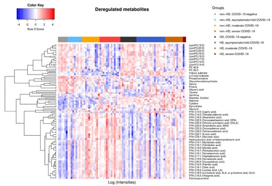 Significantly deregulated metabolites are shown in a heatmap as z-scores. Individuals are grouped according to HD and COVID-19 status.