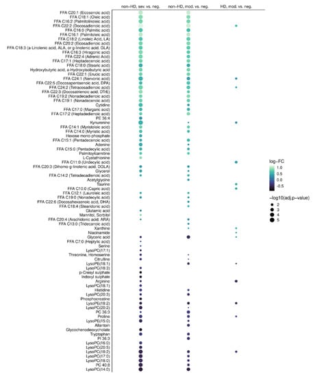 Metabolite deregulation in COVID-19 is less pronounced in HD. Significantly deregulated metabolites in the contrasts non-HD negative vs. non-HD moderate, non-HD negative vs. non-HD severe and HD negative vs. HD moderate are compared. Dot size indicates the adjusted p-value, the color scale represents the fold change of deregulated metabolites.