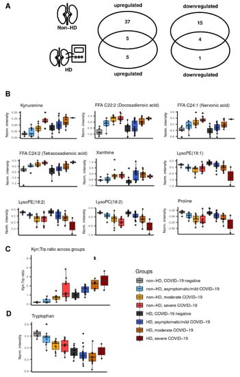 Overlapping metabolites in moderate COVID-19. (A) Venn diagrams depict overlapping and contrasting deregulated metabolites between non-HD and HD patients in the contrast negative vs. moderate COVID-19. (B) Box plots of metabolites that are jointly up- or downregulated in HD and non-HD with COVID-19 are shown. (C) The Kyn:Trp ratio across groups is shown. Lines mark the median, and boxes the interquartile range. Jittered dots represent individual values. (D) Trp levels in non-HD and HD patients with and without COVID-19 are shown as box plot.