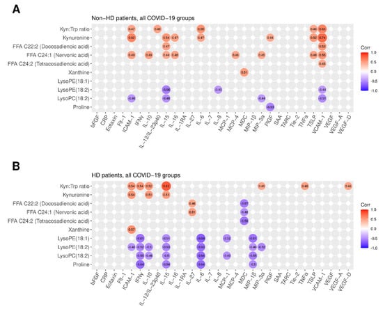Correlation matrices of deregulated metabolites and cytokine/chemokine data. A graphical representation of significantly deregulated metabolites (COVID-19 negative vs. moderate) correlated with circulating cytokine and chemokine levels is shown for (A) non-HD and (B) HD patients. Spearman correlation is indicated by the blue-red color scale and ranges from −1 (blue) to 1(red). Only significant correlations (adjusted p-value ≤ 0.05) are displayed. p-values were adjusted with Benjamini–Hochberg method.