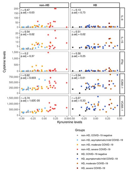 Immune response to COVID-19 impacts on circulating metabolites and vice versa []. Furthermore, evidence suggests that the inflammatory response to COVID-19 is critically altered in individuals requiring HD []. We selected the “shared metabolites” (Figure 4B) and correlated their abundance to plasma cytokine and chemokine concentrations for non-HD and HD patients separately (Figure 5A,B). Kyn levels were positively correlated with intercellular adhesion molecule 1 (ICAM-1) and IL-15 in both groups, and with vascular cell adhesion molecule 1 (VCAM-1) and IL-6 in non-HD patients only (Figure 5A,B and Figure 6). Furthermore, Kyn showed a positive association with IL-10 in HD patients (Figure 5B and Figure 6). Similar correlations were observed with the Kyn:Trp ratio (Figure 5A,B and Figure 6). Interestingly, in the HD population Kyn:Trp ratio paralleled the expression of key inflammatory mediators, interferone gamma (IFNγ), and tumor necrosis factor alpha (TNFα) (Figure 5B). Additionally, lysophospholipids (lysoPE(18:1), lysoPE(18:2), and lysoPC(18:2)) and proline were all inversely correlated with IFNγ, IL-15, and IL-6 in the HD population, whereas in non-HD patients, only lysoPE(18:2) and lysoPC(18:2) were negatively associated with IL-15 (Figure 5A,B). In neither stratum, CRP was significantly correlated with any metabolite (Figure 5A,B). Thus, despite an attenuated inflammatory response to COVID-19 [], metabolic alterations, especially Kyn abundance and the Kyn:Trp ratio, are intertwined with cytokine/chemokine release in HD. This interplay is partly overlapping with non-HD patients.