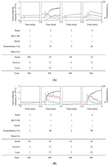 Platelet aggregation was measured using an aggregometer (PA-200 apparatus; Kowa Co., Ltd., Tokyo, Japan) with a laser scattering system as described previously [,], which can detect light transmittance and the size of platelet aggregates based on particles counting (small, 9–25 μm; medium, 25–50 μm; and large, 50–70 μm). PRP was pretreated at room temperature with 10 μM of Aβ (1–40) for 15 min. After pretreatment, PRP was preincubated for 1 min at 37 °C with stirring at 800 rpm. PRP was stimulated with 8–15 μM of TRAP or vehicle, and platelet aggregation was monitored for 4 min. The dose of TRAP of the agonists was adjusted individually to achieve a percentage transmittance of >70%. The percentage of isolated PRP was recorded as 0% and that of appropriate PPP (blank) was recorded as 100%. Adjustment of PRP for platelet count does not provide any advantage and is not necessary when using light transmittance aggregometry []. Since an aggregometer with laser scattering that was based on light transmittance aggregometry was used, the process of PRP adjustment in the platelet count was skipped to avoid unnecessary use of time.