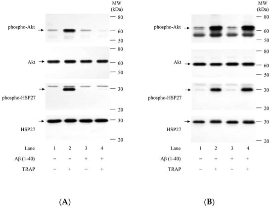 We have previously shown that TRAP-induced phosphorylation of p38 MAP kinase, but not JNK, is followed by the phosphorylation of HSP27, leading to the release of phosphorylated HSP27 into the plasma [] and that Akt in addition to p38 MAP kinase positively regulates the TRAP-induced release of phosphorylated HSP27 from human platelets in patients with DM []. Thus, we examined the effect of Aβ on TRAP-induced phosphorylation of Akt and HSP27 in human platelets. Aβ at a dose of 10 μM, which by itself barely affected the phosphorylation of Akt and HSP27, significantly decreased the levels of TRAP-induced phosphorylation of Akt and HSP27 (Figure 2A). The suppressive effect of Aβ on the phosphorylation of Akt and HSP27 is observed in the case where the platelet aggregation is suppressed (Figure 1A and Figure 2A were derived from the same samples). On the other hand, there are some cases in which Aβ did not suppress the levels of TRAP-induced phosphorylation of Akt nor HSP27 (Figure 2B). In these cases, TRAP-induced platelet aggregation was not suppressed by Aβ (Figure 1B and Figure 2B were derived from the same samples).