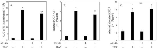 Effects of Aβ (1–40) on the TRAP-induced secretion of PDGF-AB and release of phosphorylated HSP27 from human platelets of DM patients. PRP was pretreated with 10 μM of Aβ (1–40) or vehicle at 37 °C for 15min and then stimulated with 8–15 μM of TRAP or vehicle for 5 min. The dose of TRAP achieving a transmittance of 70–100% recorded using a PA-200 aggregometer was adjusted individually. The reaction was terminated by the addition of an ice-cold EDTA solution. Platelet aggregation determined by PA-200 aggregometer and presented as AUC of % transmittance (A). The mixture was centrifuged at 10,000× g at 4 °C for 2 min, and the supernatant was subjected to ELISA for PDGF-AB (B) and phosphorylated HSP27 (C). The results obtained from 96 DM patients are shown. Each value represents the mean ± standard error of the mean. * p < 0.05, compared to the value of control. ** p < 0.05, compared to the value of agonist alone. N.S. indicates not significant.