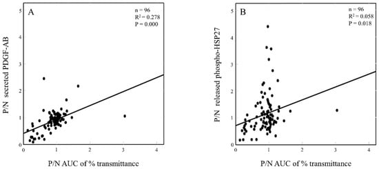 The relationship in the individual Aβ-effects between aggregation and secreted PDGF-AB or released phosphorylated HSP27 in TRAP-stimulated human platelets of DM patients. We indicated individual Aβ-effect on the TRAP-stimulated platelets of each parameter as a calculated ratio, Aβ-positive/Aβ-negative (P/N) and plotted the individual P/N AUC of % transmittance in platelet aggregation against P/N secreted PDGF-AB (A) or P/N released phosphorylated HSP27 (B) induced by TRAP stimulation in the platelets of type 2 DM patients, respectively. The data from 96 subjects were plotted and analyzed by linear regression analysis.