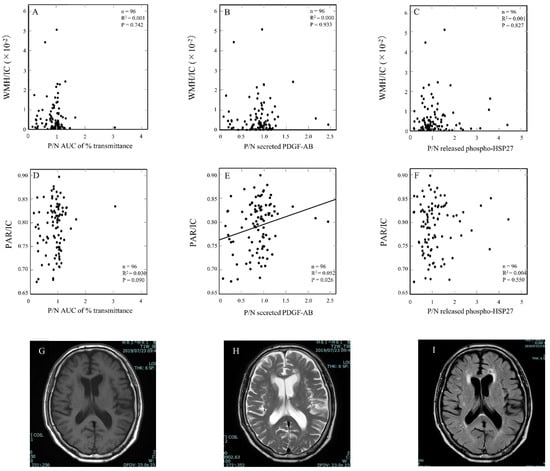 The relationship between individual levels of magnetic resonance (MR) imaging findings and Aβ-effects on the aggregation, secreted PDGF-AB and released phosphorylated HSP27 in TRAP-stimulated human platelets of DM patients. White matter hyperintensity (WMH) and brain atrophy in MR imaging were analyzed individually by an automatic segmentation application (SNIPER). Global brain atrophy was calculated as the parenchyma (PAR) volume. WMH and PAR were divided by the intracranial (IC) volume to adjust for the size of each patient’s brain. (A–C) WMH/IC were plotted against P/N AUC of % transmittance (A), P/N secreted PDGF-AB (B), P/N released phosphorylated HSP27 (C). (D–F) PAR/IC were plotted against P/N AUC of % transmittance (D), P/N secreted PDGF-AB (E), P/N released phosphorylated HSP27 (F). These data were plotted and analyzed by linear regression analysis. Representative MR images with 1.5T MR scanners are shown; T1-weighted (G), T2-weighted (H) and FLAIR (I) MR imaging.