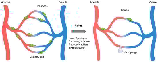 Comparison between the young and old vessels in the retina. Aging results in narrowing arteriole, retinal capillary degeneration, pericyte depletion, hypoxia, and BRB disruption. Abbreviation. BRB, blood-retinal barrier.