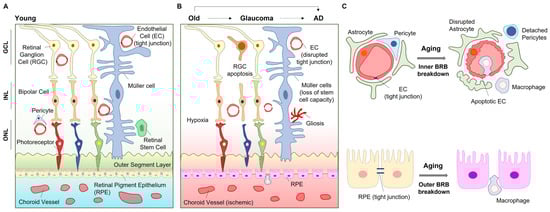 Aging processes in the eye. Young retina shows intact cellular communications for fine vision (A); however, aging and consequent age-related eye diseases (i.e., glaucoma, AD) reduce neurovascular cell communication in the eye (B). Aging and age-dependent eye diseases show inner BRB breakdown and outer BRB breakdown (C). Abbreviation. AD, Alzheimer’s disease; GCL, ganglion cell layer; INL, inner nuclear layer; ONL, outer nuclear layer.