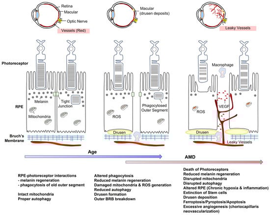 AMD has affected 196 million individuals aged 45–85 years worldwide in 2020, accounting for approximately 8.7% of the population. The majority (>85%) of AMD patients have the dry form of the disease, which is characterized by extracellular deposits called drusen (heterogeneous debris, including lipid accumulation between the RPE and Bruch’s membrane) beneath the RPE and subsequent RPE atrophy in the macula. However, there is currently no treatment for this AMD type. In dry AMD, drusen, choroidal ischemia, and vitreoretinal adhesion are independently determined by genetics and environment (i.e., smoking and diet) and may occur concurrently in variable proportions. If the resulting hypoxia and consequent vascular endothelial growth factor (VEGF) accumulation exceed the threshold, this will trigger imbalanced choroidal neovascularization [] (Figure 3). Meanwhile, wet AMD patients, accounting for approximately 15% of the total AMD patients, are administered anti-VEGF antibody therapy to inhibit blindness [,]. Narrowing vessels result in chronic hypoxia in endothelial cells with age. Chronic hypoxia and consequent accumulation of hypoxia inducible factor (HIF)-α (e.g., HIF-1α and HIF-2α) in RPE cells may be central AMD risk factors showing Bruch’s membrane thickening and metabolic changes (i.e., lipid accumulation, VEGF upregulation) in RPE limit glucose delivery to photoreceptors [].