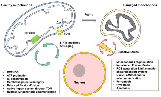 Imports of nuclear-encoded proteins into the mitochondria through translocase of the outer membrane are vital for mitochondrial functions []. Analysis of mitochondria-enriched homogenates from the postmortem neocortex of AD and age-matched controls revealed that Tom20 and Tom70 expression was reduced in AD []. Tom20 and Tom22 may play key roles in ATP production and OXPHOS in astrocytes []. Thus, nucleus-mediated protein import into the mitochondria is critical for energy supply. Altered morphological feature of ferroptosis is mitochondrial dysfunction, including a smaller mitochondrial volume through imbalanced fission, fusion, and rupture of the mitochondrial outer membrane []. Iron accumulation and lipid peroxidation in the aging retina may be attributed to ferroptosis-induced retinal cell death in age-related retinal diseases []. Thus, aging may facilitate mitochondrial depletion and consequently diminish the interactions between the nucleus and mitochondria (Figure 4).
